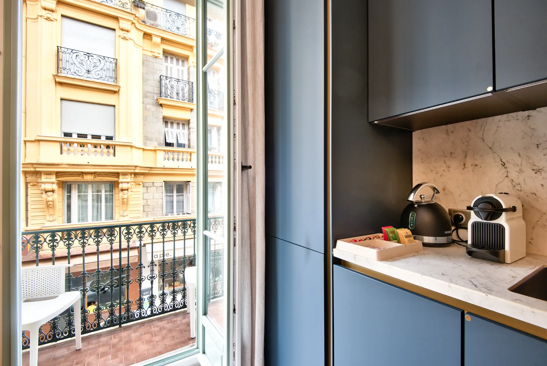 Aujourd’hui, l’Aparthôtel Alberti honore cet héritage. La rénovation a du marier les matériaux d’origine — pierre, bois et fer forgé — avec une esthétique minimaliste contemporaine. Séjourner ici, c’est profiter du confort moderne (cuisines haute facture, domotique discrète) tout en étant entouré de murs qui ont vu naître la Nice moderne.